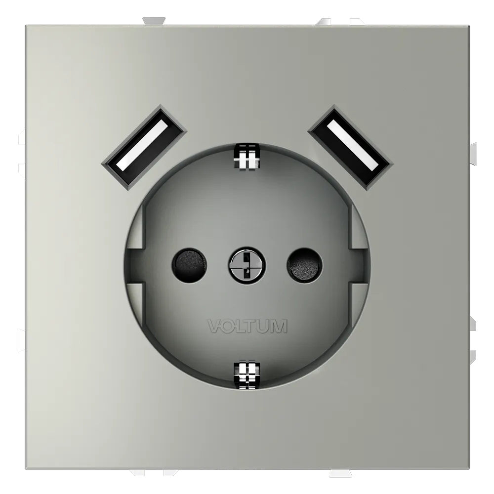 Розетка встраиваемая VOLTUM S70 с заземлением и защитными шторками, 16А, с USB, A+A, (сталь)
