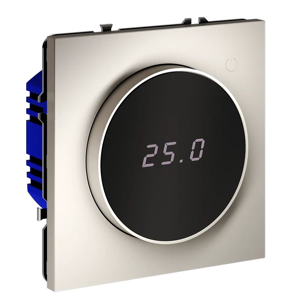 Место установки. Терморегуляторы Voltum предназначены для регулирования температуры электрического теплого пола. Актуальны как в городских квартирах, так и в загородных дачных домах без центрального отопления. Корпус. Дизайн терморегуляторов Voltum сочетается со стилем остальных электрических устройств компании. Они совместимы со всеми рамками. Материал внешних декоративных элементов — поликарбонат. Конструктивные особенности. Терморегуляторы работают с любыми типами теплых полов и рассчитаны на нагрузку до 3500 Вт. Устройства оснащены светодиодной индикацией режима и дисплеем, на котором отображается температура поверхности пола. Красный индикатор — «подача питания на нагревательный кабель (идет процесс нагрева)», отсутствие индикации — «заданная температура достигнута». В течение 15 минут после нагрева терморегулятор переходит в интеллектуальный «спящий режим», уменьшая яркость подсветки цифр и сокращая энергопотребление. Регулировка осуществляется вращением панели управления. Терморегулятор поставляется в комплекте с механизмом из пластиковой накладки и датчиком температуры.